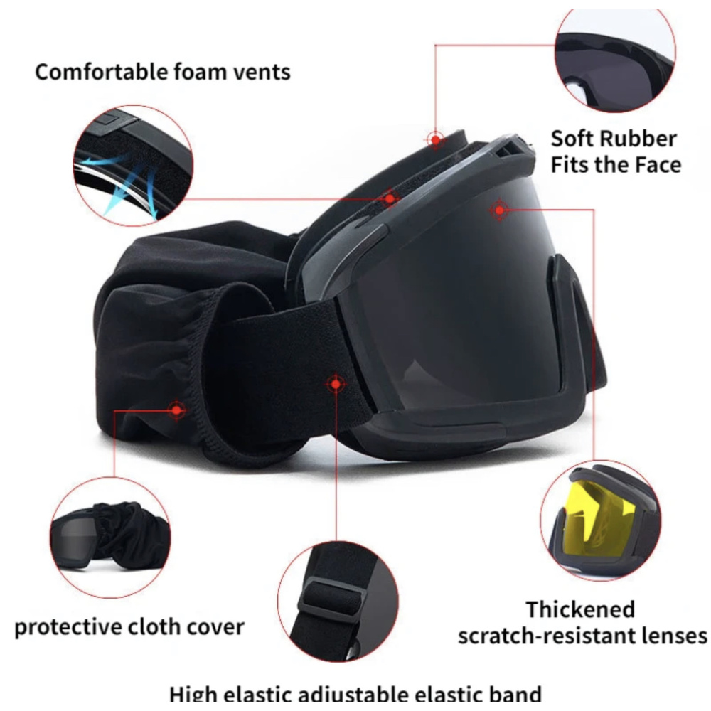 3 лінзи: темна, жовта та прозора. Лінзи виготовлені із полікарбонату. Товщина лінзи складає 3 мм.Регульована гумка ширина 35 мм. для фіксації окулярів із м'яким чохлом.